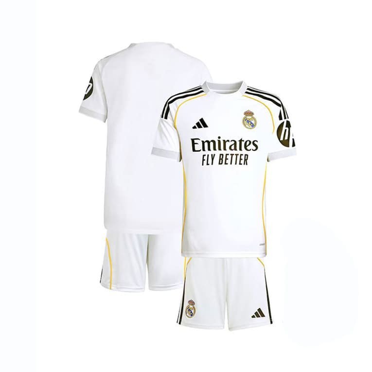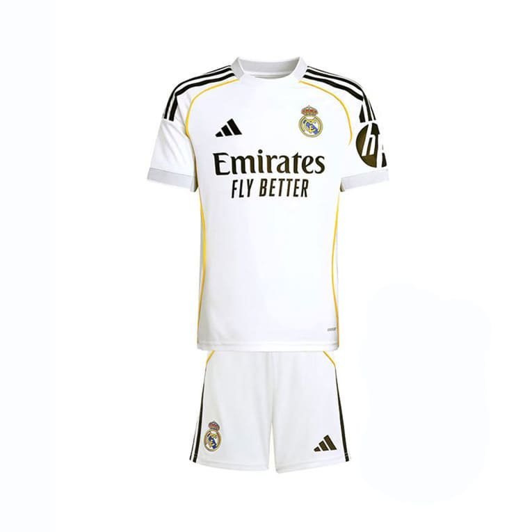 Étiquettes : Maillot kit Real Madrid, Maillot Real Madrid 2025/2026, Maillot Real Madrid domicile, Maillot Real Madrid enfant